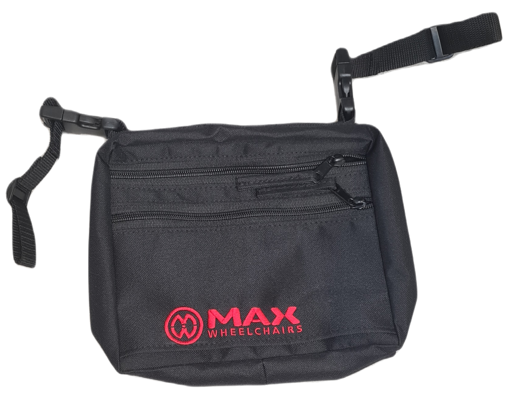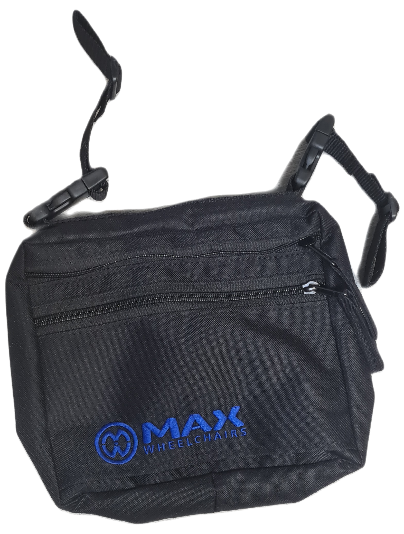 Handy under-seat VELCRO wheelchair bag with the Max Wheelchairs embroidered logo.